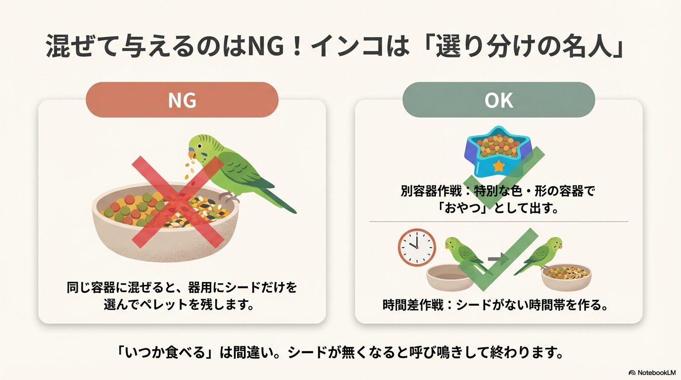 「嫌いなもの(ペレット)」と「好きなもの(シード)」を混ぜると、ペレットが邪魔者扱いされて余計に嫌いになってしまうこともあります。メリハリをつけて提示することが、遠回りのようで一番の近道になります。