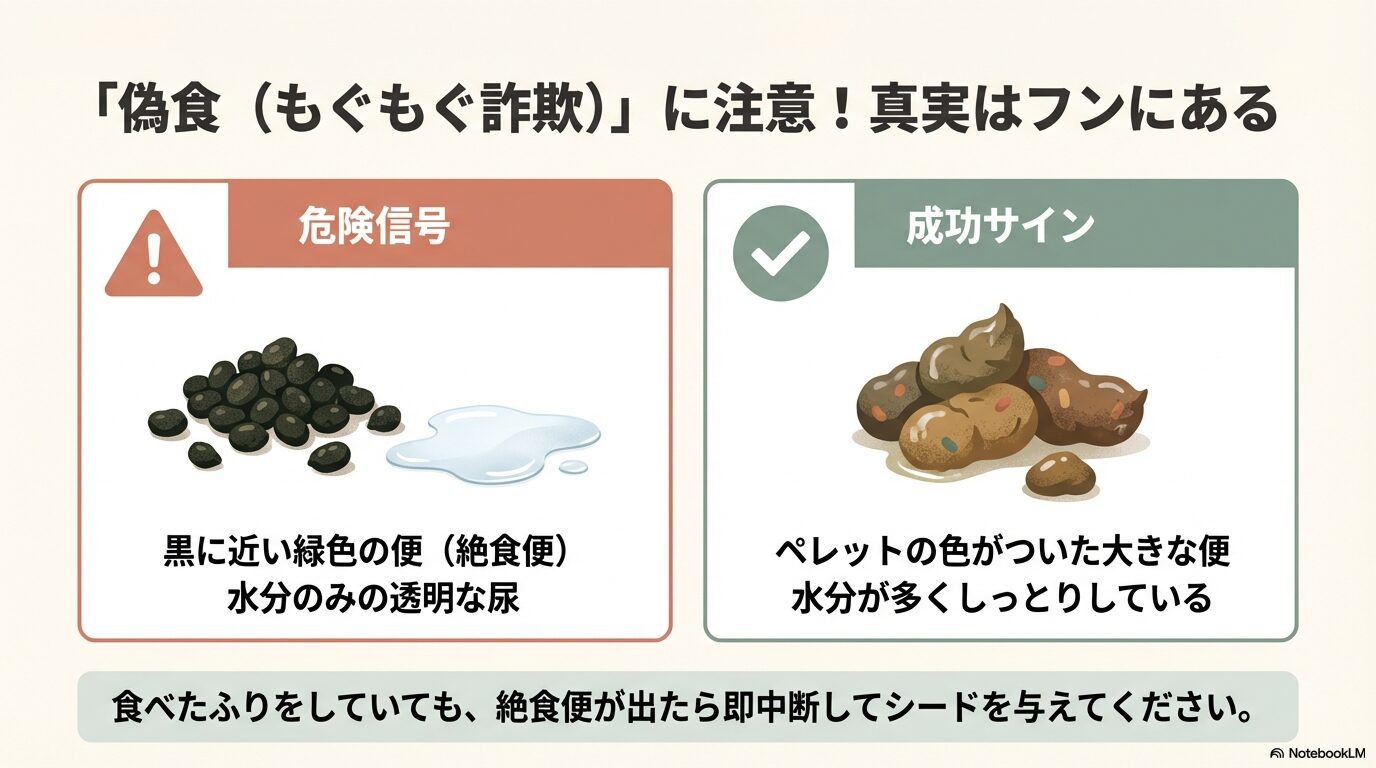 もし、フンの量が極端に減り、濃い緑色の粘液状の便(胆汁がそのまま出ている状態)や、水分だけの便が見られたら、それは鳥さんが飢餓状態にある緊急サインです。すぐに切り替えを中断し、いつものシードをたっぷり与えてください。