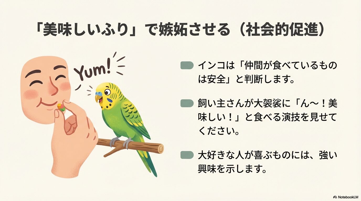 インコは群れで生活する社会性の高い生き物です。「仲間が食べているものは安全で美味しい」と判断する習性があります。