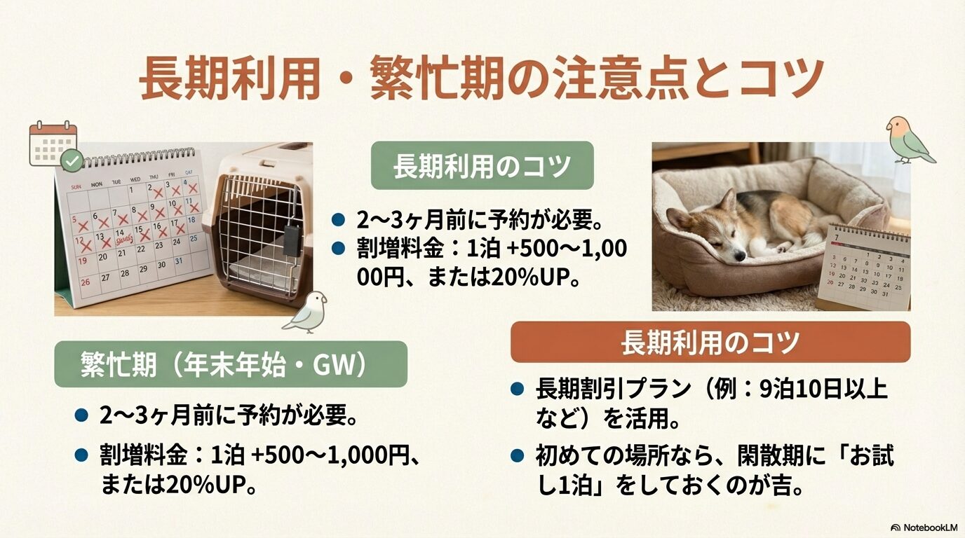 - 長期利用や繁忙期の料金相場と予約をスムーズに取るコツ