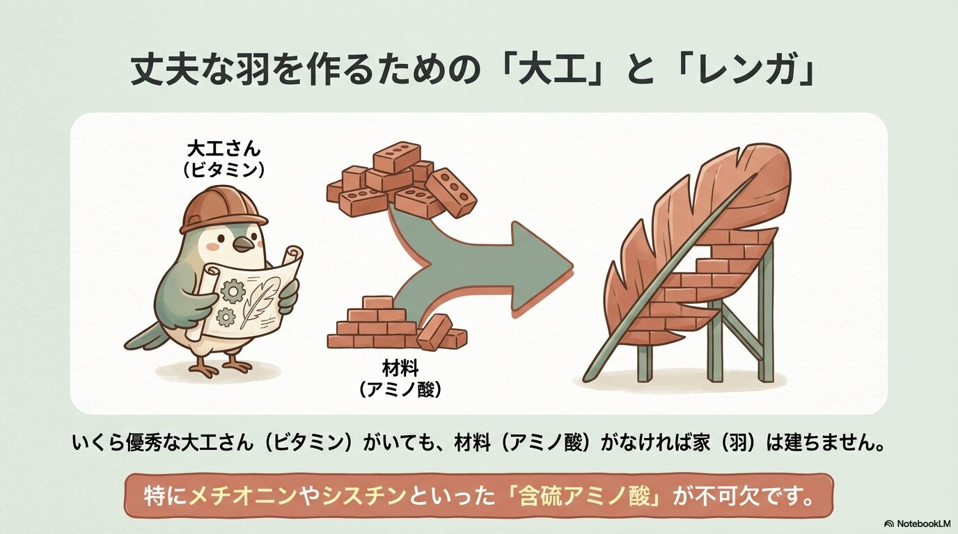 「羽を作る」という作業を建築に例えるなら、ビタミンは「大工さん」、アミノ酸は「レンガ(材料)」です。いくら優秀な大工さん(ビタミン)がいても、材料となるレンガがなければ立派な家(羽)は建ちません。