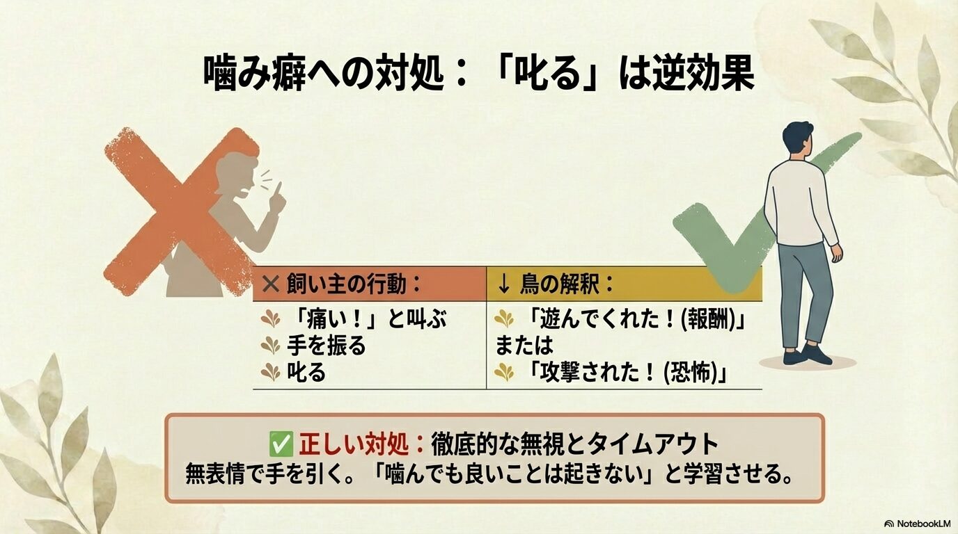 効果的な対処法は、「徹底的な無視」と「タイムアウト」です。もし指を噛まれたら、グッと痛みをこらえて声を出さず、無表情で静かに手を引くか、鳥さんを床にそっとおろして背を向けます。「噛んだら、大好きな飼い主さんがいなくなってしまう」「噛んでも楽しいことは何も起きない」ということを学習させるのです。これを一貫して繰り返すことで、噛むという行動のメリットをなくしていきます。