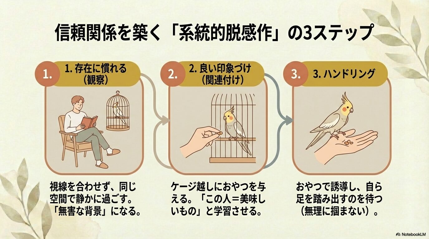 最初のステップは、触ることではなく「同じ空間にいること」への許容です。ケージのそばで椅子に座り、鳥の方を見ずに静かに本を読んだりスマホを見たりして過ごします。これは「私はあなたに関心がないし、危害を加えない背景の一部だよ」と伝えるためです。鳥さんがリラックスして羽繕いを始めたり、ご飯を食べ始めたりしたら、あなたの存在を受け入れ始めたサインです。これを数日から数週間続けます。