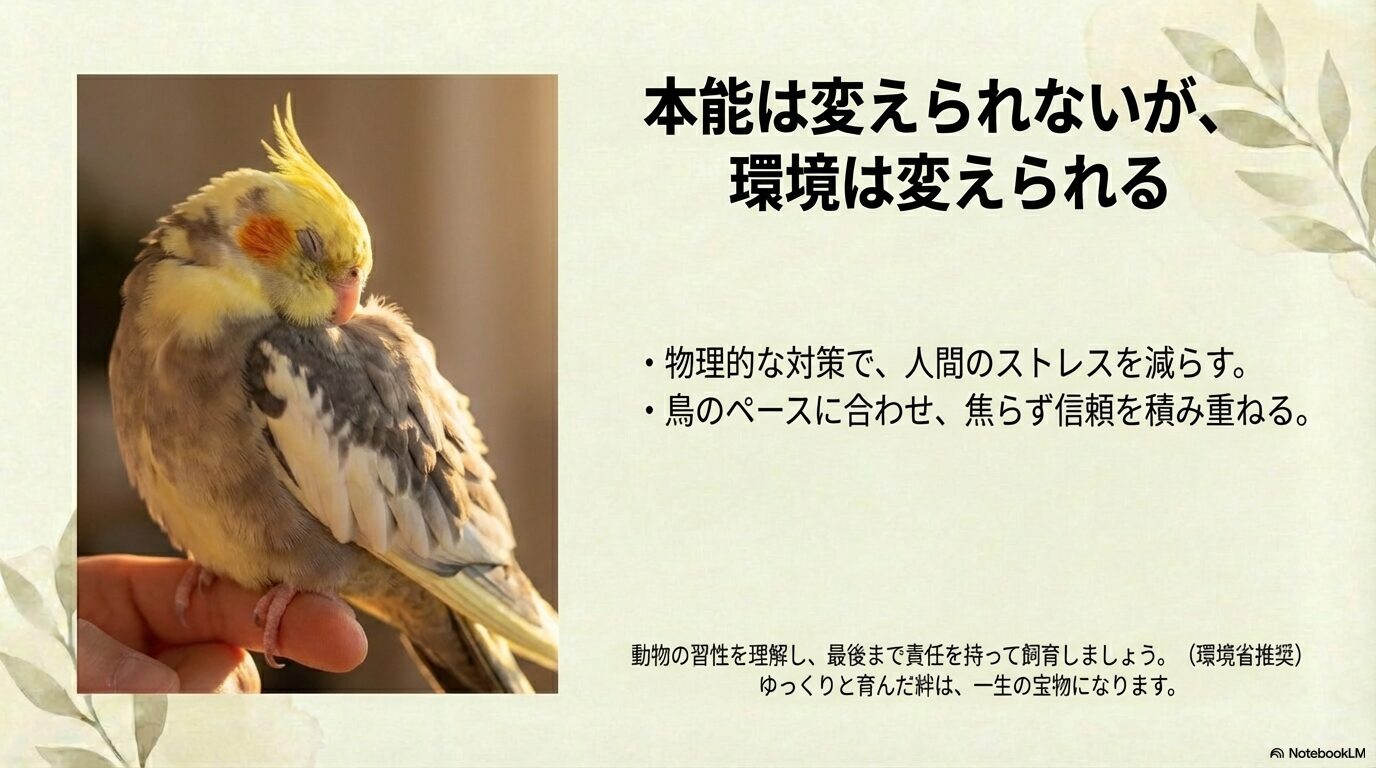 彼らの本能そのものを変えることはできませんが、環境を整え、私たちの接し方を変えることはできます。アクリルケースや防音カーテンといった物理的な対策で「多少うるさくても大丈夫」な環境を作り、人間の側のストレスを減らすこと。そして、焦らずゆっくりと、鳥さんのペースに合わせて信頼関係を育てていくこと。これが、オカメインコと幸せに暮らすための唯一の、そして最良の近道かなと思います。