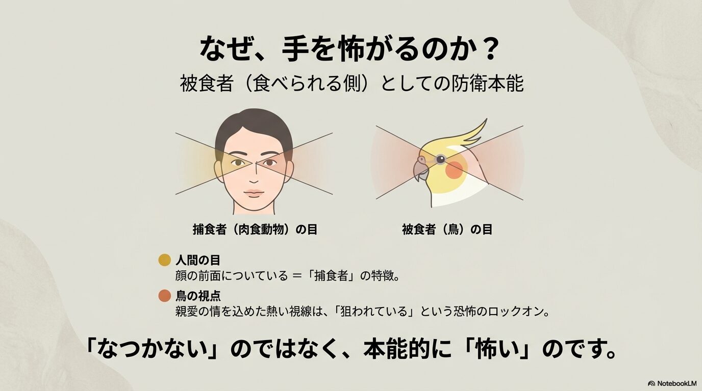 私たち人間は、オカメインコから見れば「自分より何十倍も大きい、正体不明の巨大生物」です。さらに悪いことに、人間の顔(特に両目)は顔の前面についています。これは、獲物を狙う「肉食動物(捕食者)」の特徴そのものです(被食者の目は、広い範囲を見渡せるよう顔の側面についています)。つまり、あなたが親愛の情を込めて熱い視線を送れば送るほど、オカメインコにとっては「巨大な捕食者にロックオンされている!」という恐怖の対象として映ってしまうことがあるのです。