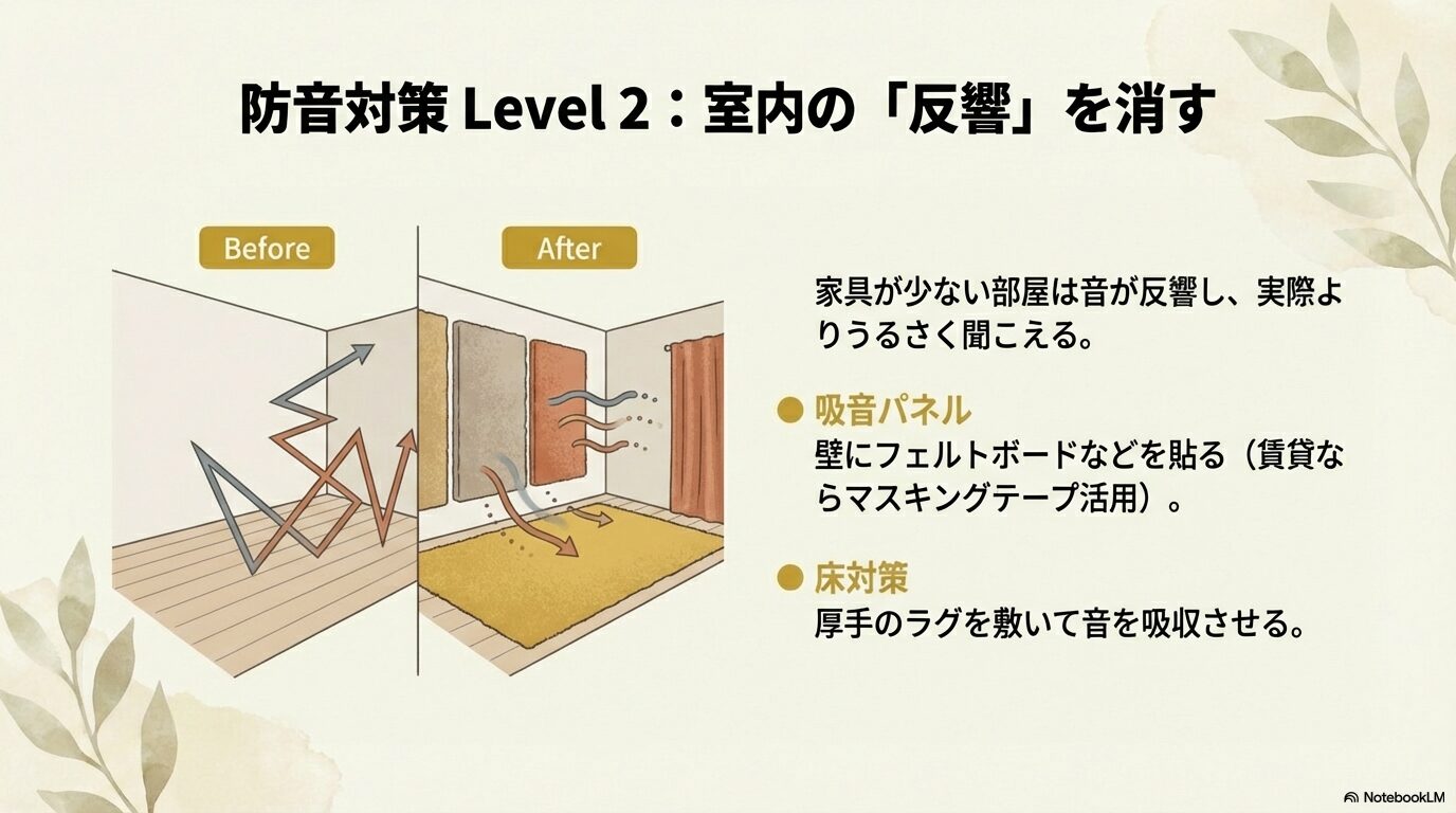 部屋の中に家具や物が少ないと、音が反響して実際の音量以上にうるさく聞こえてしまいます。壁に「吸音パネル(フェルトボードなど)」を貼ったり、床に厚手のラグを敷いたりすることで、室内の残響音を減らすことができます。これは外部への音漏れ対策になるだけでなく、部屋の中での会話の聞き取りやすさ向上など、飼い主さんの快適性アップにもつながります。