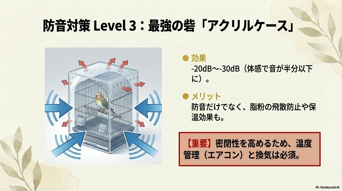 マンションやアパートでオカメインコと暮らす際、近隣への配慮として最も効果が高く、即効性があるのが「アクリルケース」の導入です。これは、鳥かご(ケージ)全体を厚みのある透明なアクリルボックスで覆ってしまうという方法で、多くの愛鳥家さんが実践している「最後の砦」とも言える対策です。