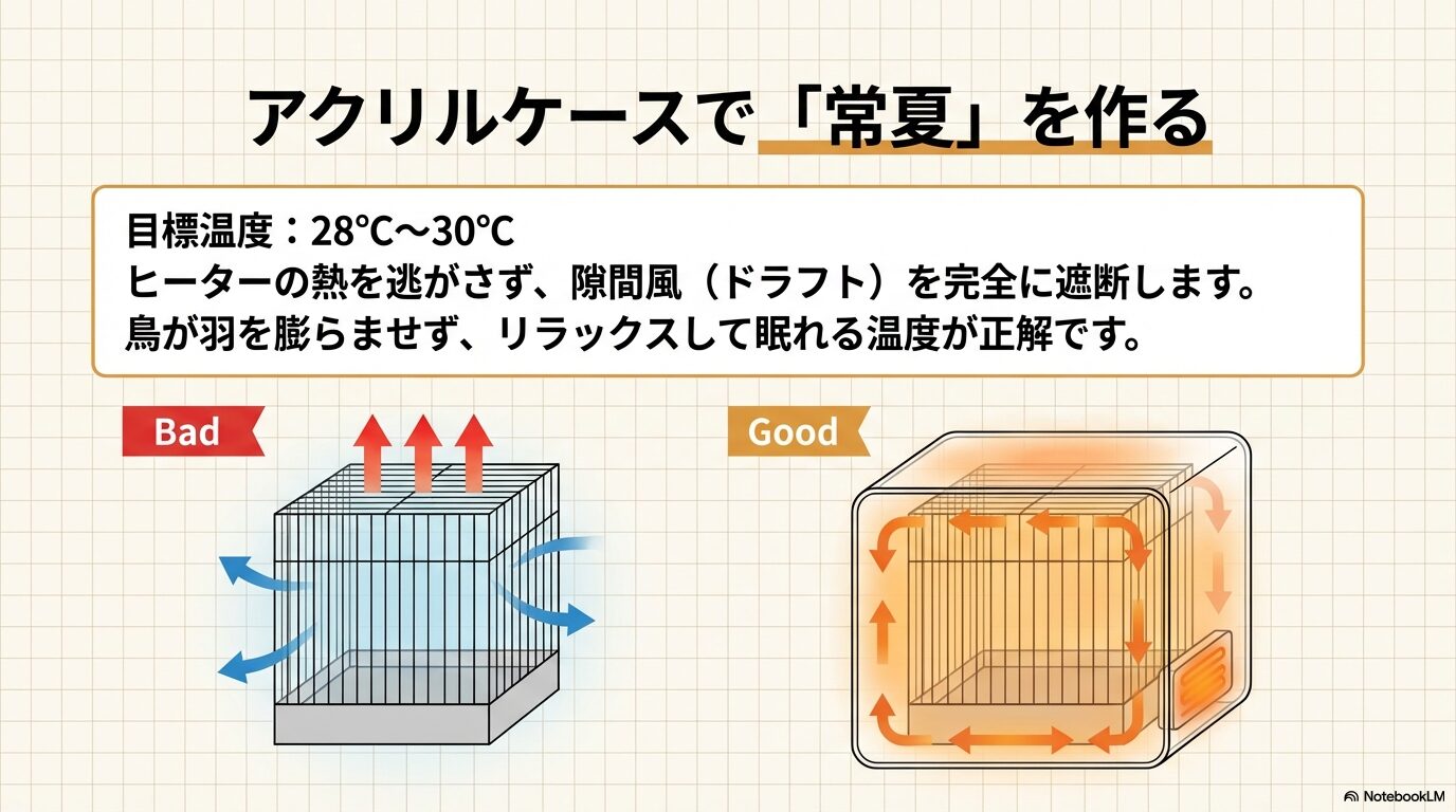 アクリルケースでケージを囲うと、ヒーターの熱が内部に留まり、循環するため、少ない電力で効率よく設定温度(例えば30℃)をキープできます。何より、インコの体温を奪う最大の敵である「隙間風(ドラフト)」を完全に遮断できる点が大きなメリットです。