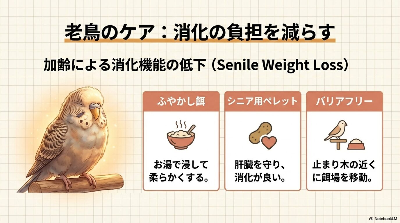 2. シニア用ペレットの活用: ラウディブッシュ社の「シニアダイエット」など、老鳥向けに設計されたペレットは、消化吸収が良いように加工されており、かつ肝臓を守るための成分調整がされています。粒が大きい場合は、すり鉢で粗く砕いてあげると喜んで食べます。