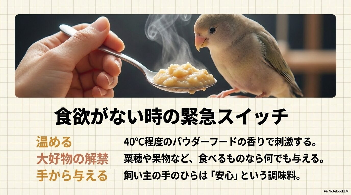 鳥が羽を膨らませず、リラックスして眠ったり、活動したりできる温度までしっかりと上げてあげてください。環境が安定すると、驚くほど食欲が戻り、体重が増え始めるケースは本当に多いです。