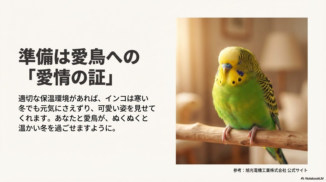 ヒーターの準備は、単なる道具の購入ではなく、愛鳥への「愛情の証」です。
