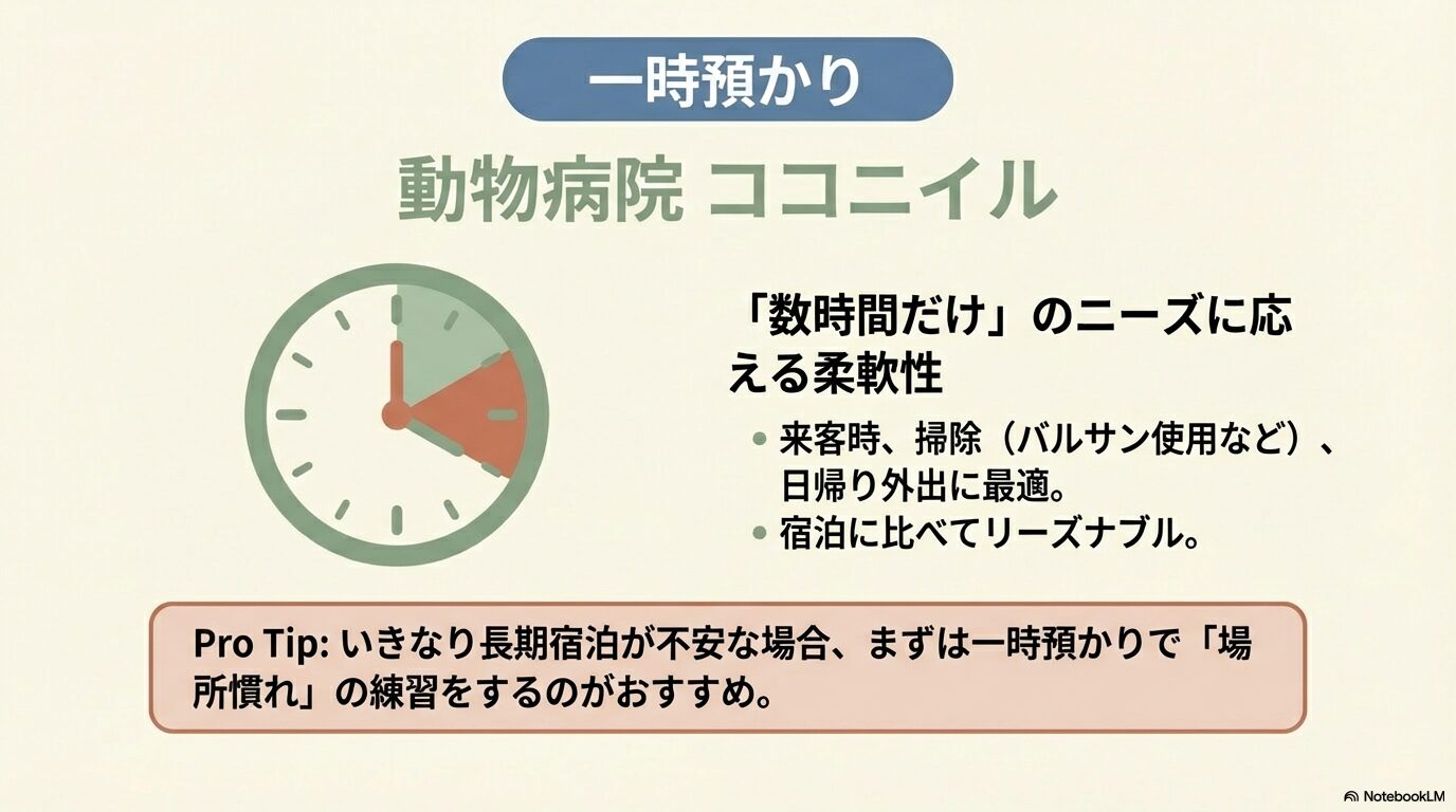 料金も宿泊に比べてリーズナブルに設定されていることが多く、日帰りでのお出かけや、来客がある時などにも重宝します。いきなり何泊も預けるのが不安な場合は、まずはこの一時預かりを利用して、場所やスタッフさんに慣れてもらう「練習」をするのも賢い使い方かもしれませんね。