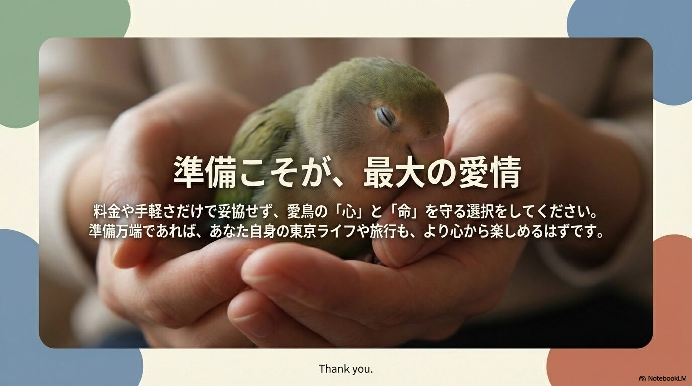 この記事が、あなたと愛鳥の安心で快適な暮らしのヒントになれば、これ以上嬉しいことはありません。準備万端で、素敵な東京ライフ(そして時には旅行!)を楽しんでくださいね!