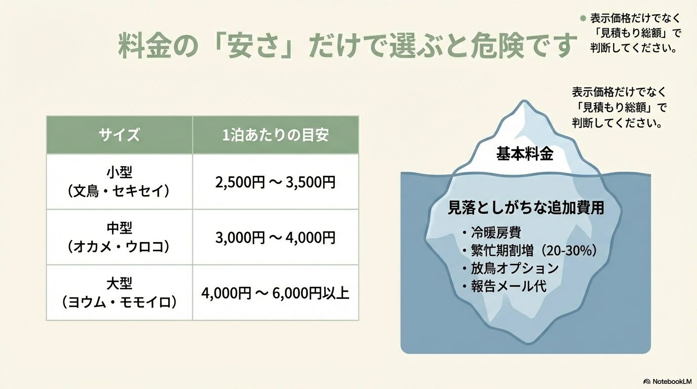 | 鳥種・サイズ | 1泊あたりの料金相場 | 備考 |