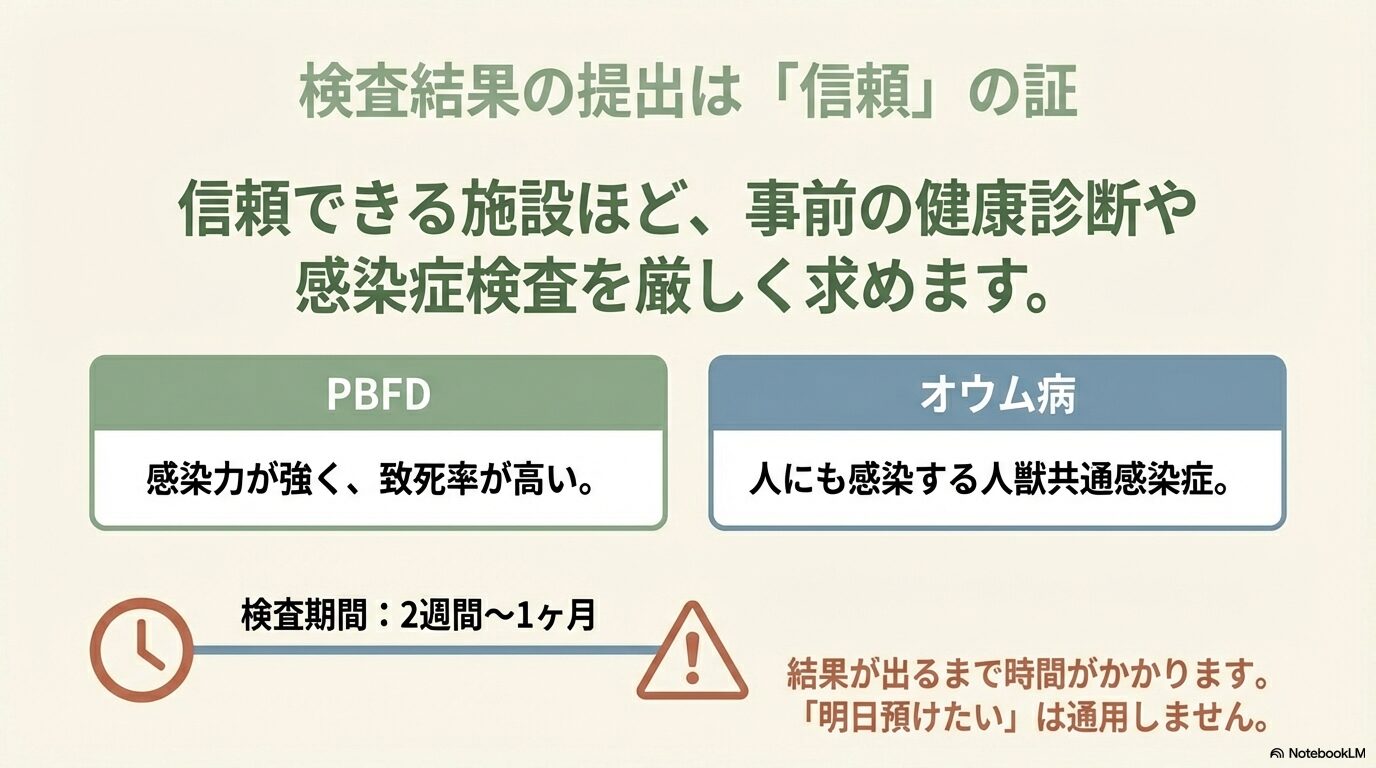 これらの病気は、見た目が元気であっても「保菌」している可能性があり、環境の変化によるストレスで発症することがあります。もし、検査なしで預かるようなホテルがあったとしたら、逆に「他の感染している鳥が同じ空間にいるかもしれない」と疑った方が良いでしょう。