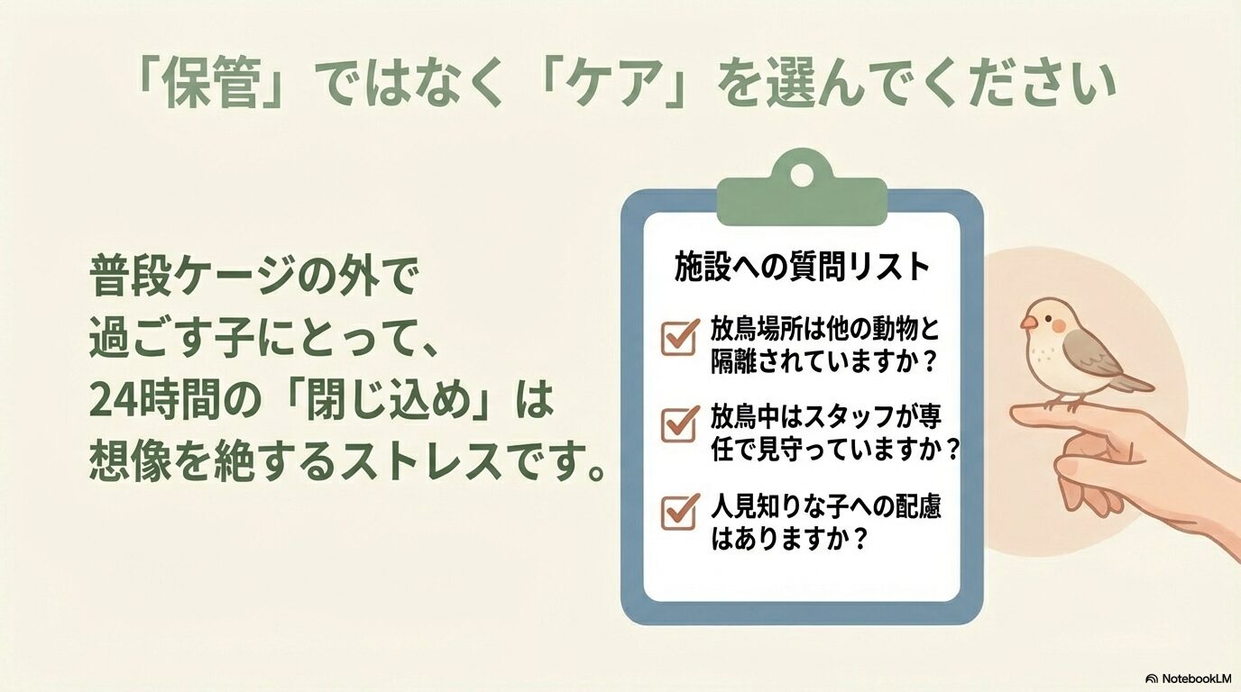 インコを預けるということは、単に物理的な居場所を確保するだけでなく、彼らの「心」と「命」を他人に託すということです。だからこそ、料金の安さだけで妥協せず、以下のポイントをしっかり確認して選んであげてください。
