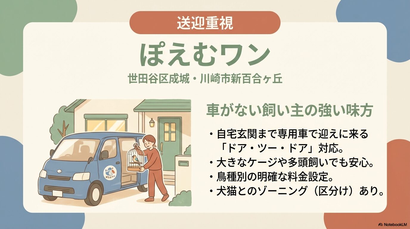 先ほどもお話しした通り、インコの電車移動はリスクの塊です。ぽえむワンでは、送迎エリア内であれば自宅まで迎えに来てくれるサービスを提供しています(※エリアや料金は要確認)。特に、大きめのケージごと預けたい場合や、多頭飼いで移動が大変な場合には、この「ドア・ツー・ドア」の安心感は何物にも代えがたいものがあります。